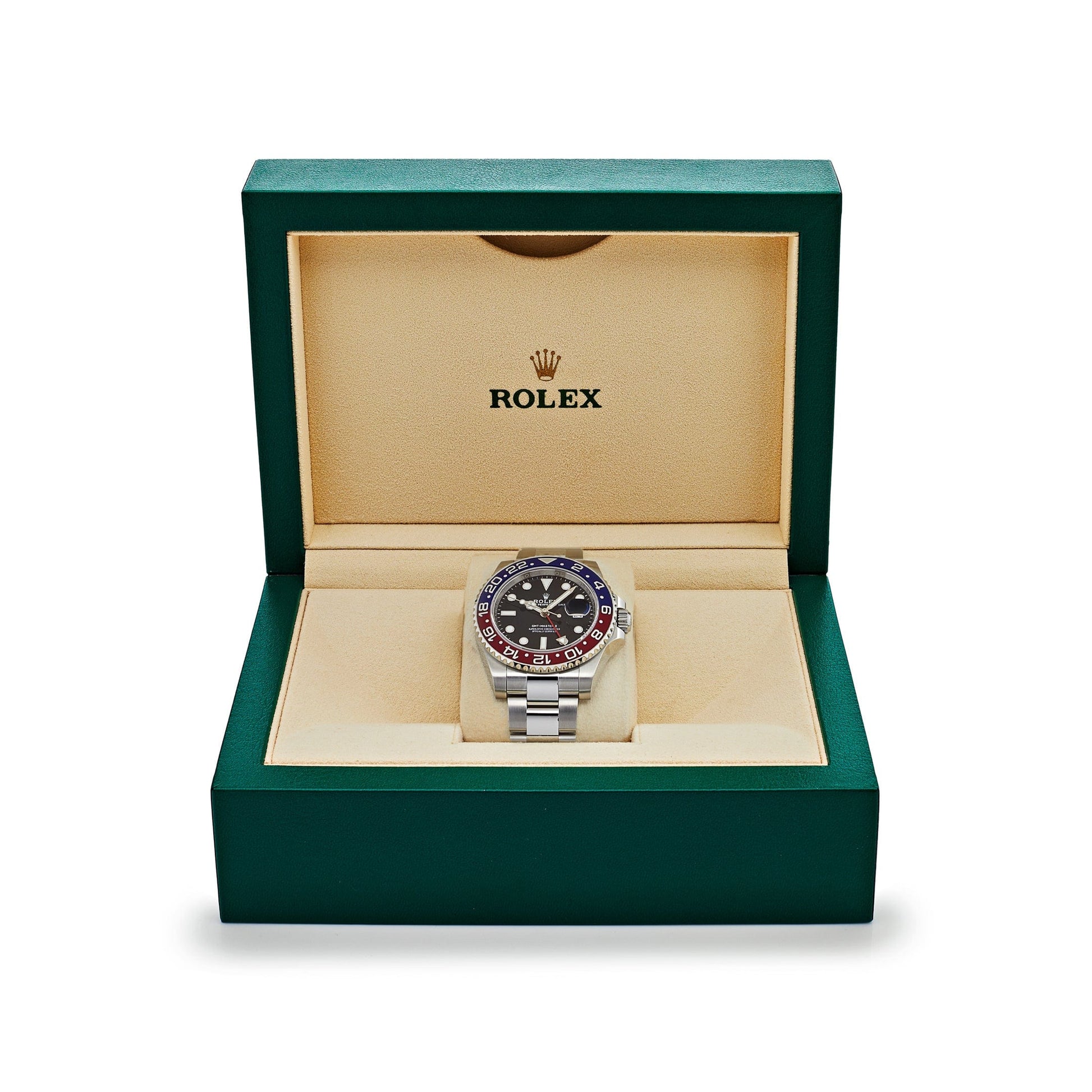 The 2025 Watch GMT Master II is one of 2025 Watch's finest creations. The case measures 40mm and is made of stainless steel. featuring a red and blue Pepsi design and 24hr cerachrom bidirectional bezel. It's black dial and white luminous hour markers elevates the design. attracting a world of travelers. It is finished with a stainless steel oyster bracelet and folding clasp.?